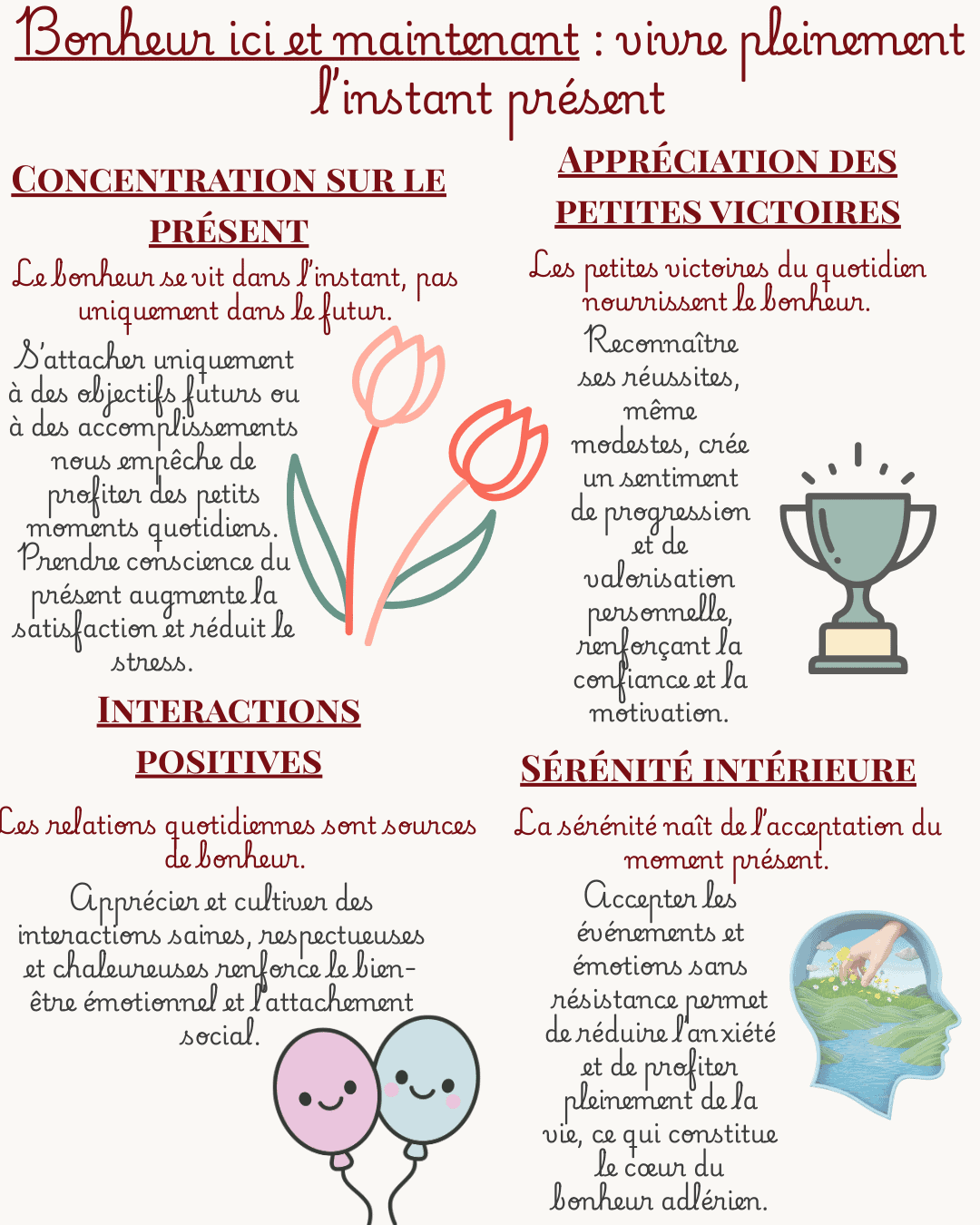 Bonheur ici et maintenant — Vivre pleinement l’instant présent et apprécier les petites victoires nourrit un bonheur durable et intérieur.