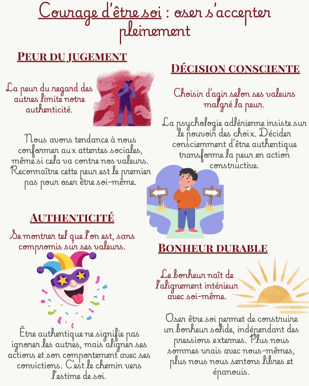 Oser être soi-même demande de dépasser la peur du jugement et de la critique. Cela signifie prendre des décisions alignées avec ses valeurs, et non avec les attentes des autres. Le vrai bonheur naît de l’authenticité et de l’acceptation de soi.