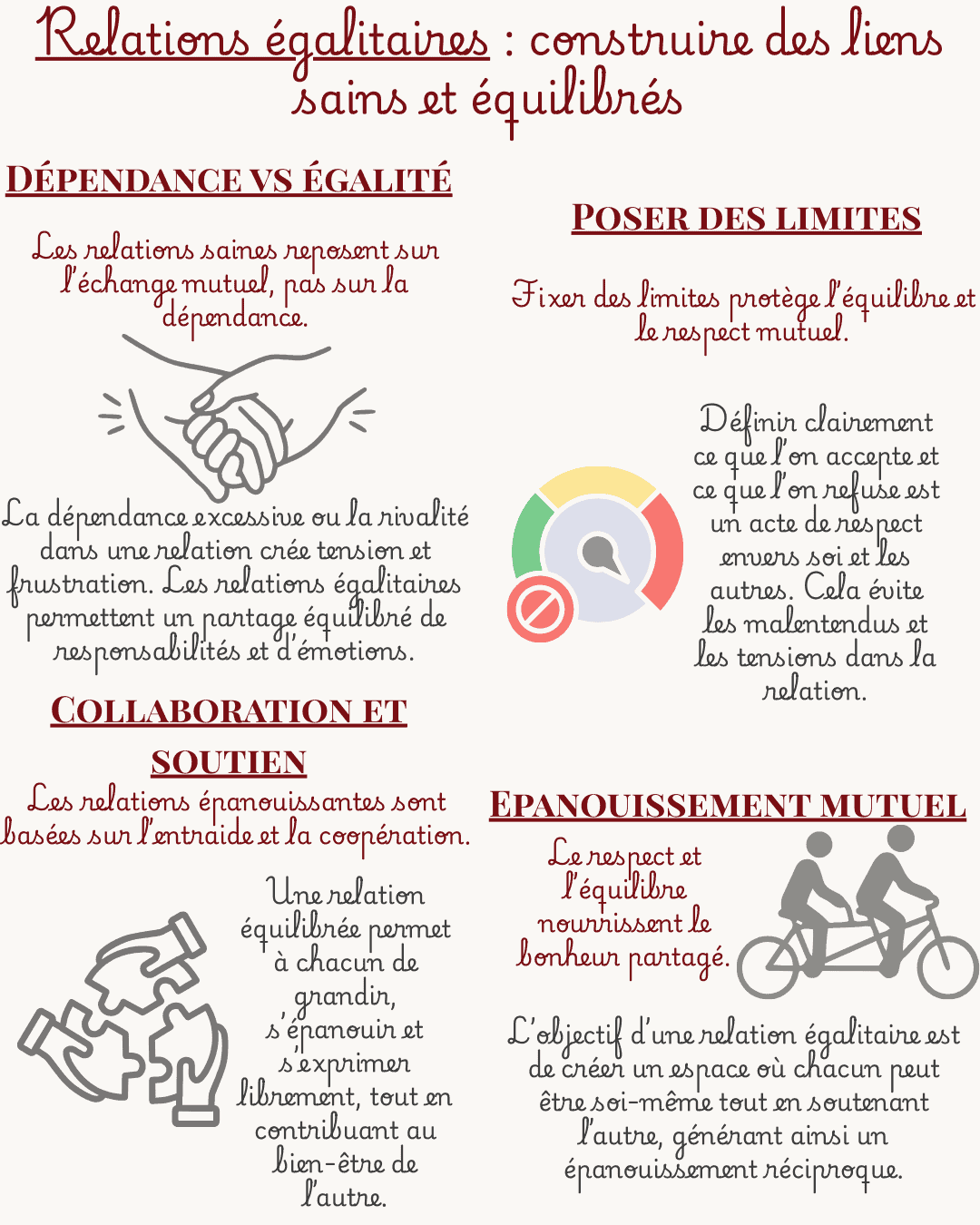 Les relations saines sont fondées sur la réciprocité et l’égalité. La dépendance ou la rivalité fragilise les liens. Apprendre à poser des limites et à valoriser l’échange mutuel permet de construire des interactions épanouissantes.