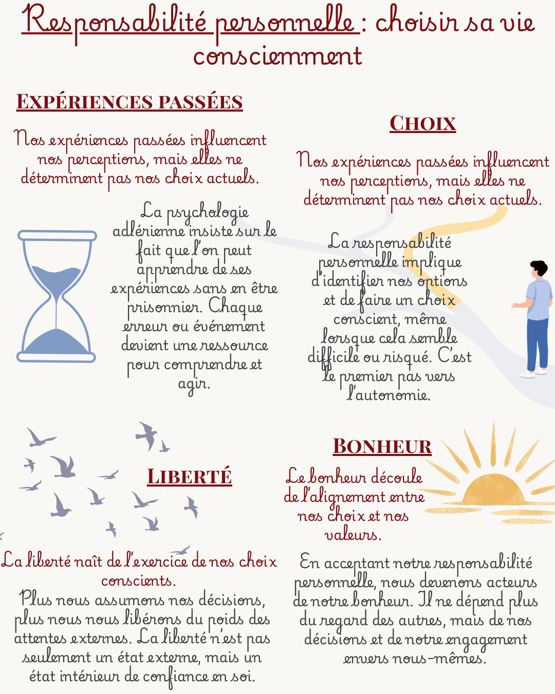 La psychologie adlérienne insiste sur le fait que nos expériences passées ne doivent pas définir nos comportements actuels. Chaque décision que nous prenons est le reflet de notre choix conscient — cela implique de reconnaître nos erreurs et d’apprendre d’elles, plutôt que de blâmer le passé.