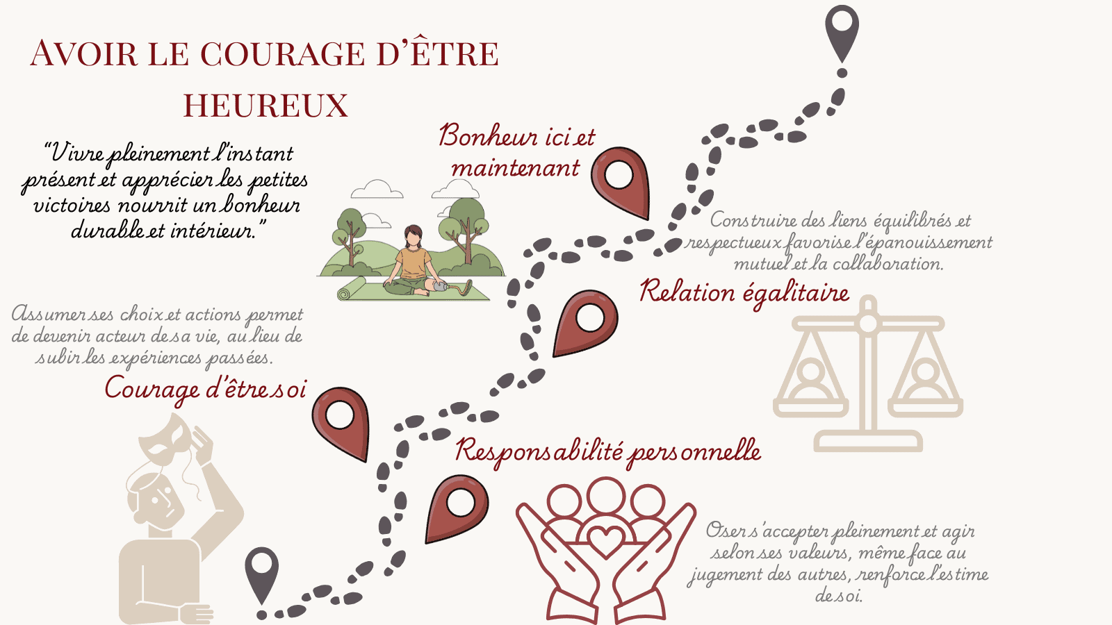 En lisant Avoir le courage d’être heureux, j’ai réalisé à quel point nous sommes responsables de nos vies. Tout ce qui nous arrive découle souvent de nos choix, qu’ils soient conscients ou non. Cette idée de responsabilité personnelle m’a touchée : nous sommes à la fois créateurs et témoins de notre existence.